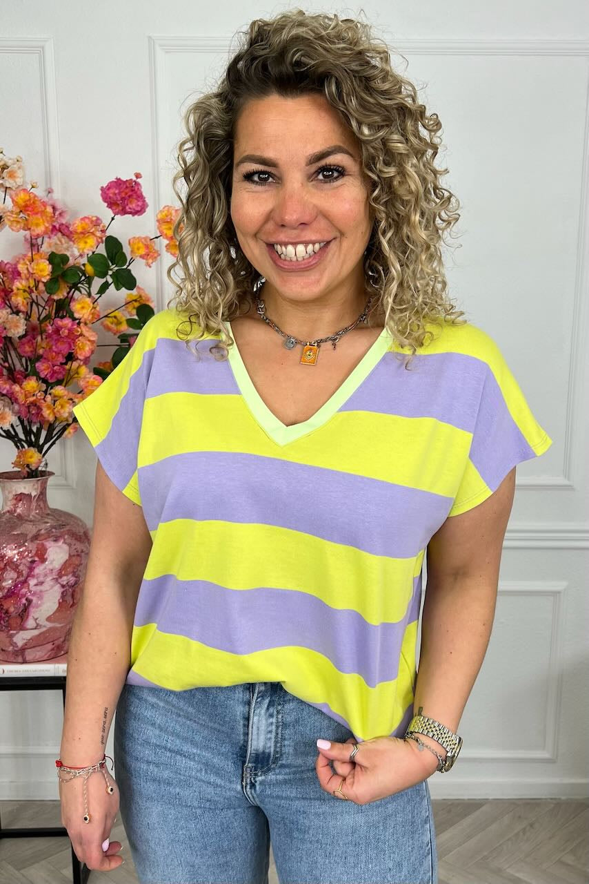 Wonderful V Neck Striped Shirt - Lime/Lila