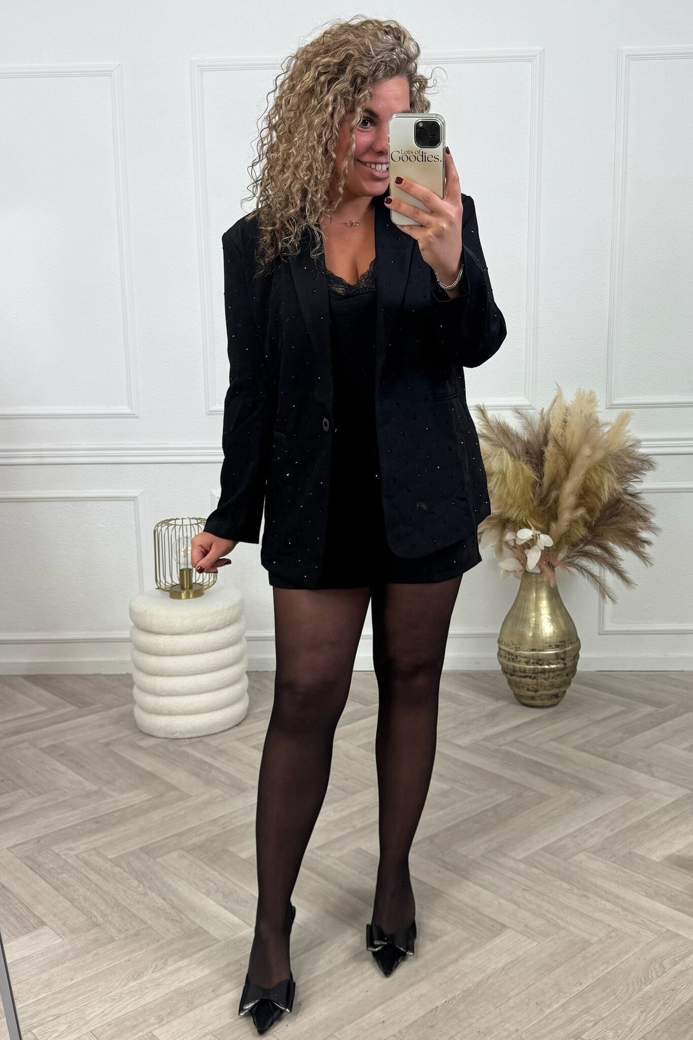 We love it! De strass studs zijn gemaakt in de kleur van de stof! Beautiful! Shop de blazer in combi met de short in black!